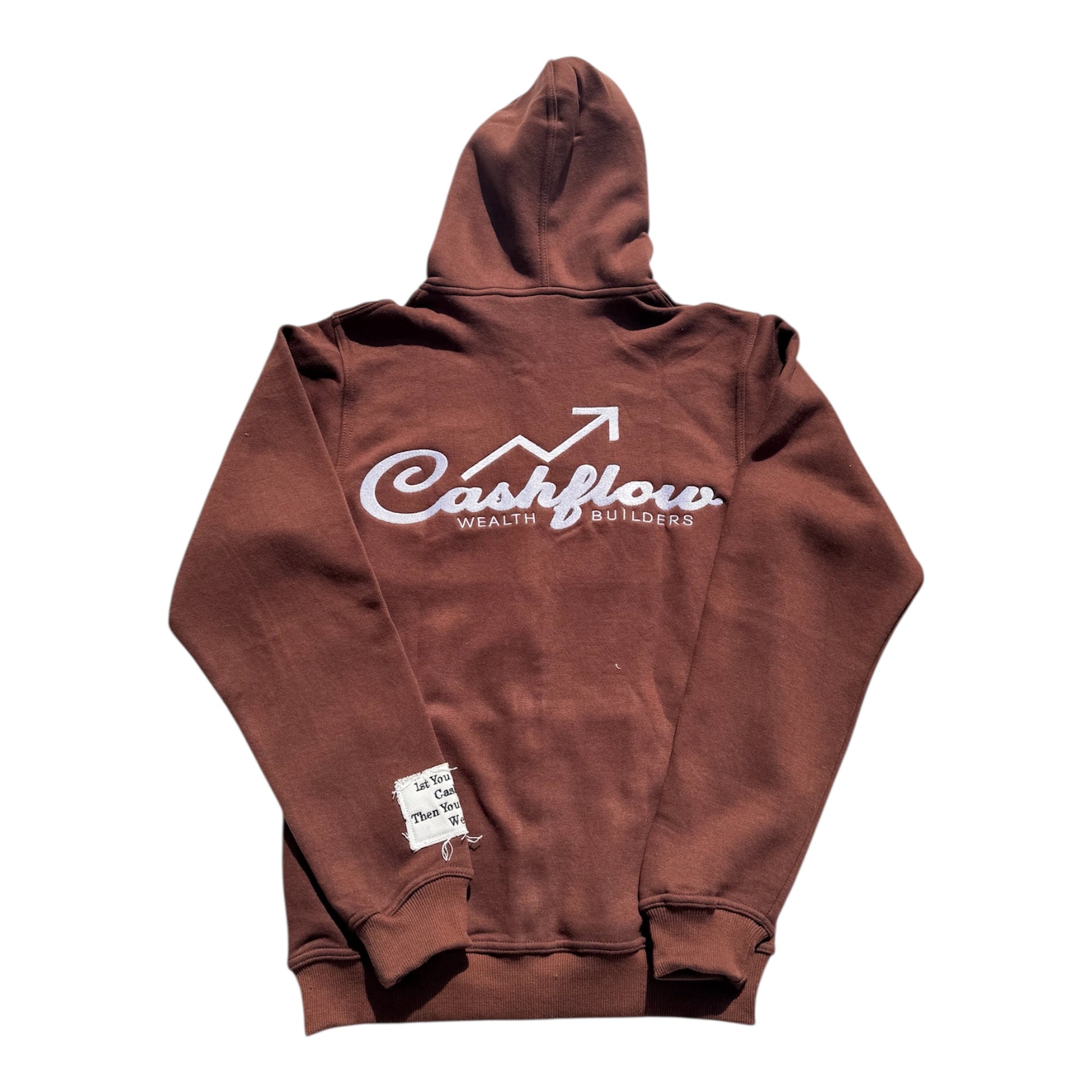 Elevate your hustle with the Cashflow Wealth Builders Hoodie. Crafted from premium cotton blend fabric. Designed for the driven, this heavyweight brown zip-up features bold lettering across the chest spelling "CFWB" and "WEALTH CLUB" in a rugged, distressed style for added texture and presence.